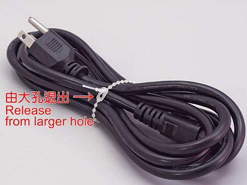 用途:扎線(xiàn)帶束緊后,往小孔推扣卡住,可再松開(kāi),重復使用。